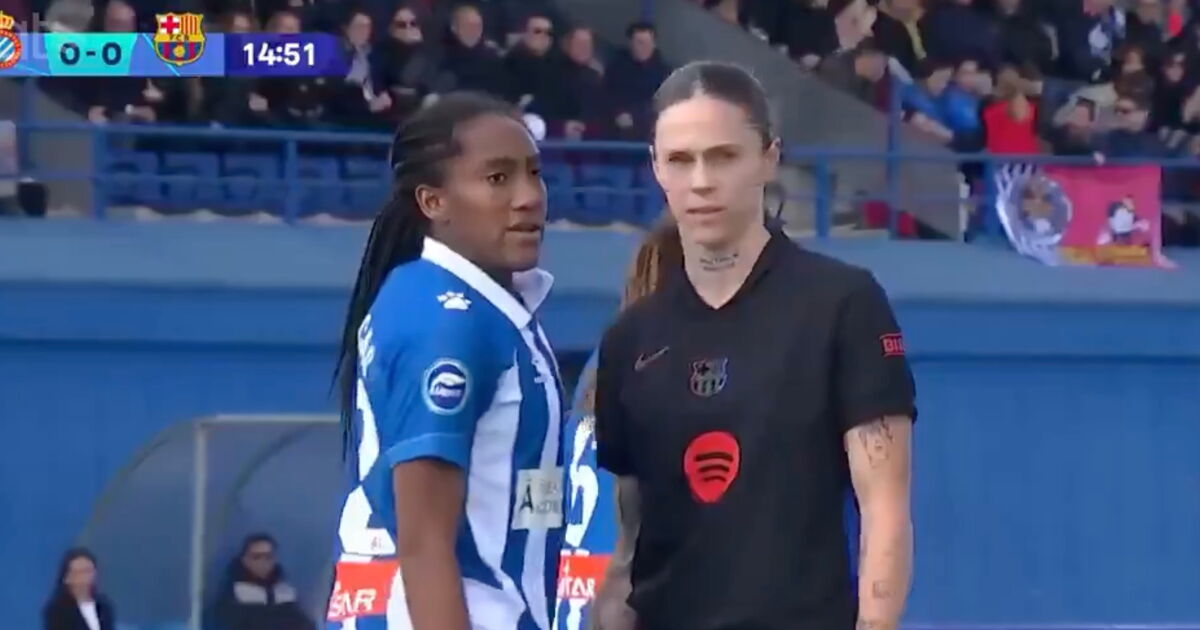 Video of FC Barcelona player María Pilar León and RCD Espanyol player Daniela Caracas from the Sunday, February 9, match began circulating on social media earlier this week. The clip shows León and Caracas bumping into each other. León pauses and stares at Caracas briefly before appearing to tap her below the waist. León looks away before quickly snapping her head back toward Caracas and saying something to her. She then shoves Caracas, and play continues, apparently without further incident.