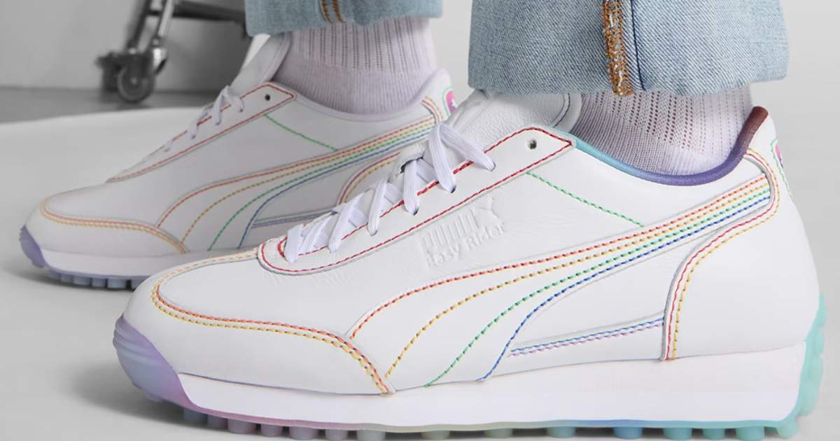 Puma’s Pride collection this year, part of their Equal Love Confederation initiative, includes two sneakers featuring subtle rainbow designs. The “Easy Rider Pride” sneaker is white with rainbow stitching on the top and a rainbow pattern on the sole.